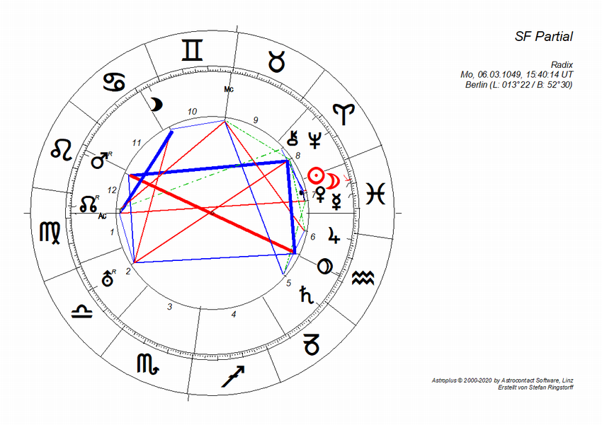 Aus dem Anfangshoroskop der derzeitig wirksamen Sonnenfinsternis vom 6.3.1049 zeigt sich eine Thematik, die etwas mit dem rückläufigen Mars in gradgenauer Opposition zum Pluto zu tun hat. Die Venus steht in recht genauer Konjunktion zum Neumond. Symbolisch steht das Ganze für Kraft und eine anpackende Haltung, die von großer Leidenschaft hin bis zur Besessenheit getragen sein kann. Intensive Gefühle kommen plötzlich auf und nähren sich durch eine romantische Sehnsucht. Krieg und Frieden sind unmittelbar damit verbunden. Standpunkte wollen durchgesetzt werden und Maßlosigkeit bricht sich Bahn.